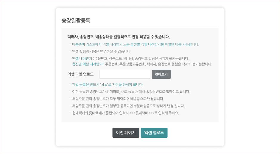 ① 송장일괄등록 : 송장번호가 입력된 파일을 공급사에서 전달 받으셨다면 ‘송장일괄등록’ 버튼을 클릭하여 화면 이동합니다. 아래 화면에서 엑셀 파일을 업로드하면 주문상태가 자동으로 배송중으로 변경됩니다.