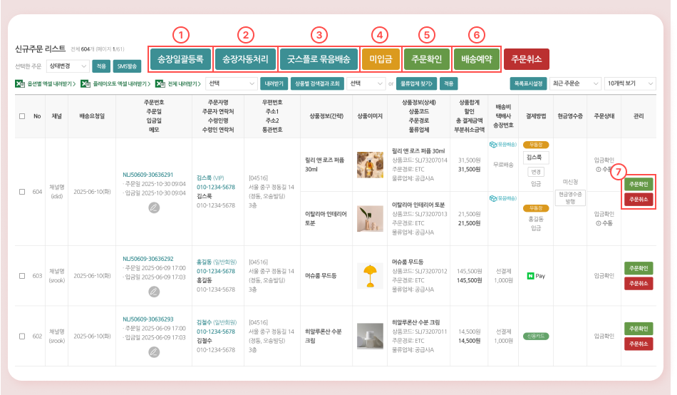 ④ 미입금: 미입금 클릭 시 선택된 주문건이 미입금 상태로 변경됩니다.