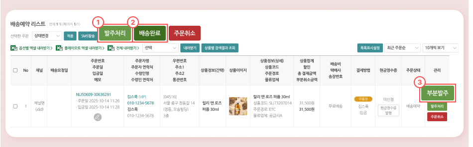 ∘ 부분발주된 주문내역은 부분배송중 페이지로 이동됩니다.