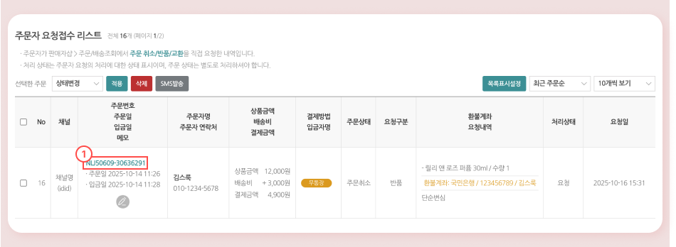 ① 주문번호: 교환 처리할 주문의 주문번호를 클릭하여 주문상세로 이동합니다.