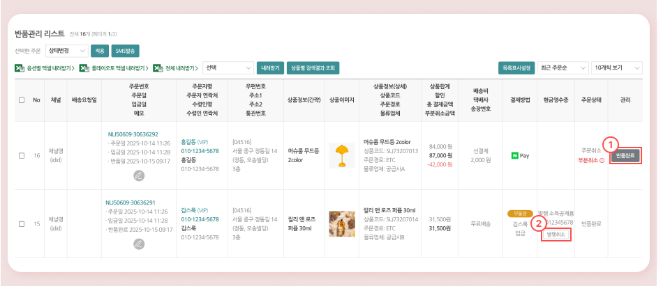 ① 반품완료: 반품처리가 완료되면 반품완료 버튼을 클릭합니다.