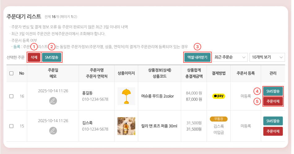 ① 주문검색: 이름(통합)/주문자명/주문번호/수령자명/관리자 메모/상품코드/주소를 선택한 후에 검색내용을 입력할 수 있습니다.